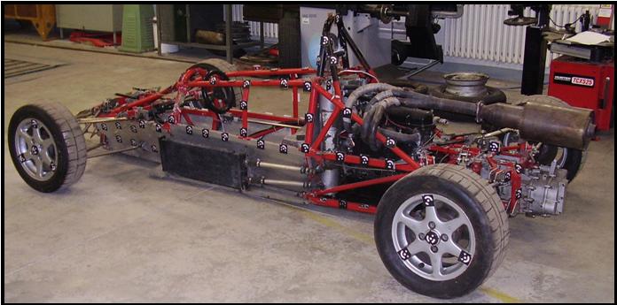 Measurements of kinematic characteristics of suspension and geometry of wheels by TRITOP are done as follows. Coded points of the TRITOP system are placed on the wheel rim. Other points are placed on the car’s chassis or body. Multiple measurements are done that make it possible to determine the plane and center of the wheel (unit vector of the wheel is used here). In this way, suspension geometry can be obtained, as well as kinematic characteristics – when measurements are done in several height levels of the car’s body and various steering angles.