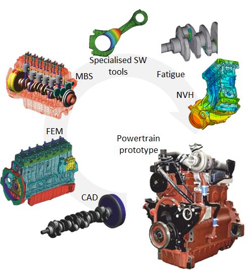 Modul klikový mechanismus jako centrální modul virtuálního motoru včetně modelu kluzných ložisek umožňující řeší libovolné koncepce klikového mechanismu (motory řadové, vidlicové, hvězdicové, s protiběžnými písty nebo speciální koncepce)